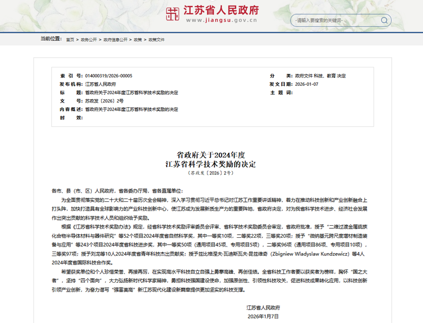 省政府在奖励决定中指出,希望获奖单位和个人珍惜荣誉、再接再厉,面向国家重大需求和人民生命健康,持续加强原创性、引领性科技创新,为实现高水平科技自立自强、推动江苏高质量发展作出新的更大贡献。