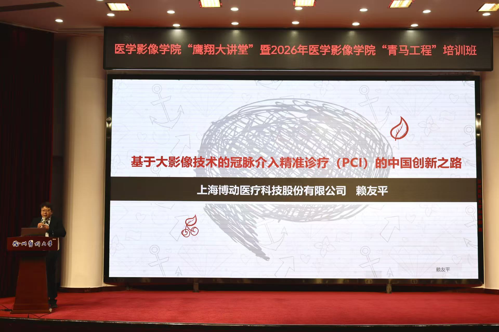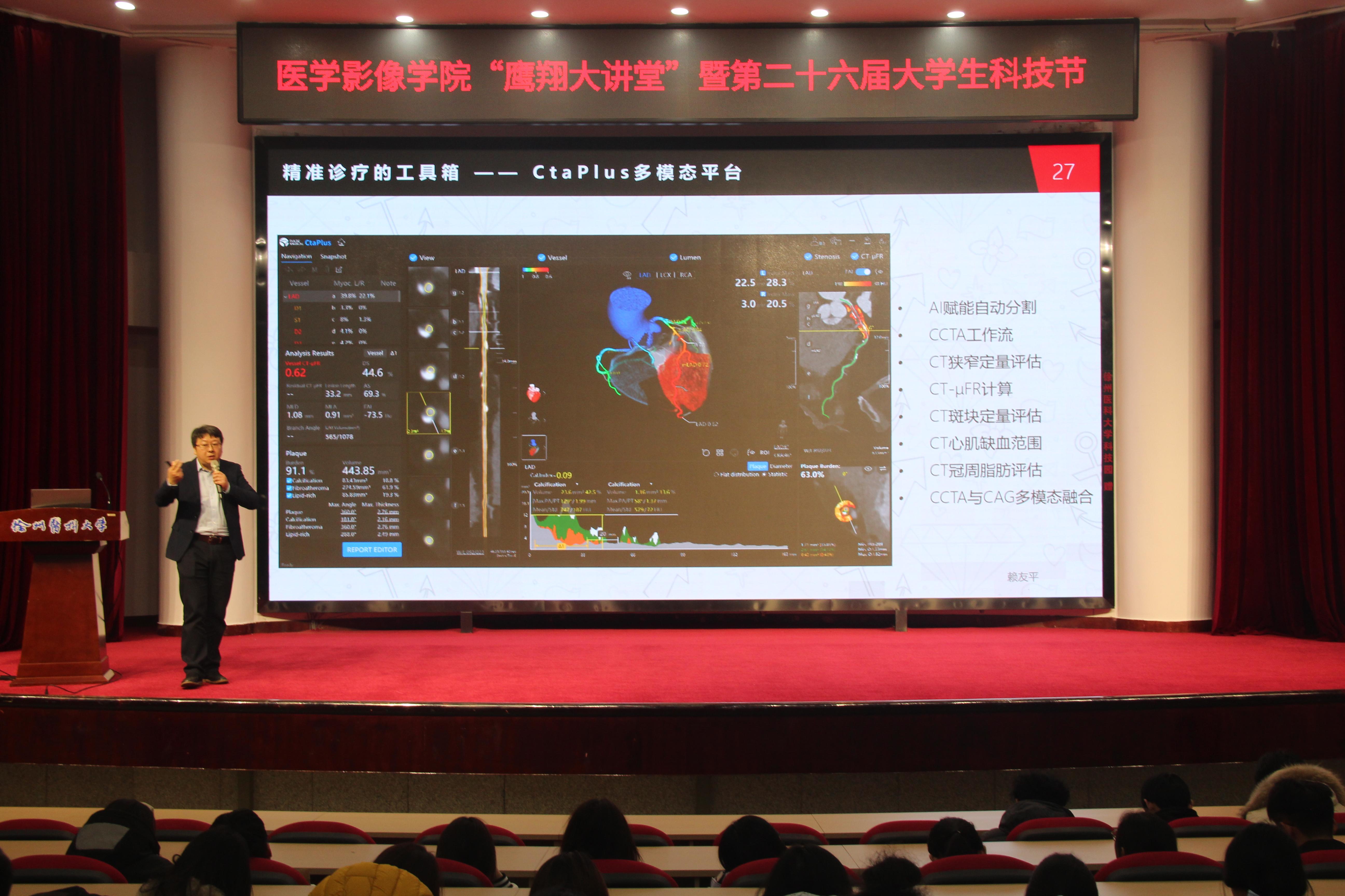 3月12日晚,医学影像学院在学术报告厅举办“鹰翔大讲堂”。本期讲座以“冠脉介入精准诊疗的中国创新”为主题,特邀2000级影像校友、上海博动医疗集团国内市场总监赖友平老师担任主讲,学院领导、教师代表及各年级同学共同参加。讲座由学院党委副书记谢广明主持。